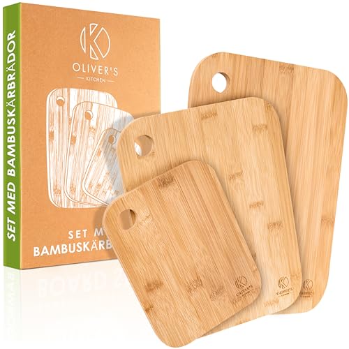 Oliver's Kitchen ® 3 x Set med skärbrädor i trä - Olika storlekar för varje tillfälle - Designade, hållbara och slitstarka - 100% naturliga ekologiska bambuskärbrädor - Lätta att rengöra