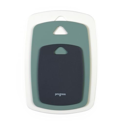 Progress 3-delat skärbräde-set i plast – skärbrädor för kök och matberedning, liten, medium och stor, diskmaskinssäker, för kött, grönsaker och bröd, grå, grön och vit
