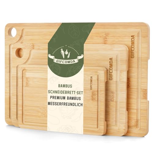 Gifcomda skärbräda bambu set om 3 – tjocka skärbrädor set med juicespår och handtag, premium skärbrädor för kött, frukt, ost och grönsaker, mångsidig köksinsats