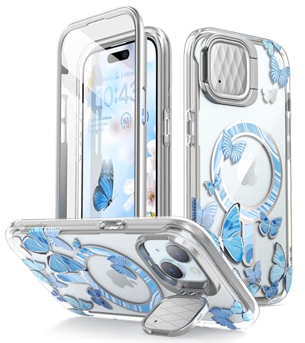 i-Blason Fodral för iPhone 15/iPhone 14/iPhone 13 6.1-tum med Kamerahölje, [MagSafe Kompatibel] Tunt och Snyggt Skydds Fodral för Hela Kroppen med Inbyggt Skärmskydd (Blå Fjäril)