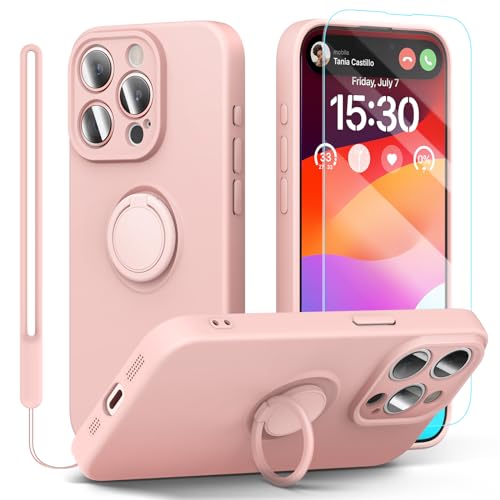 pcgaga Silikonfodral för iPhone 15 Pro med skärmskydd [ringhållare stativ] [handledsrem] [mikrofiberfoder] smalt stötsäkert skyddsfodral, 6,1 tum, rosa