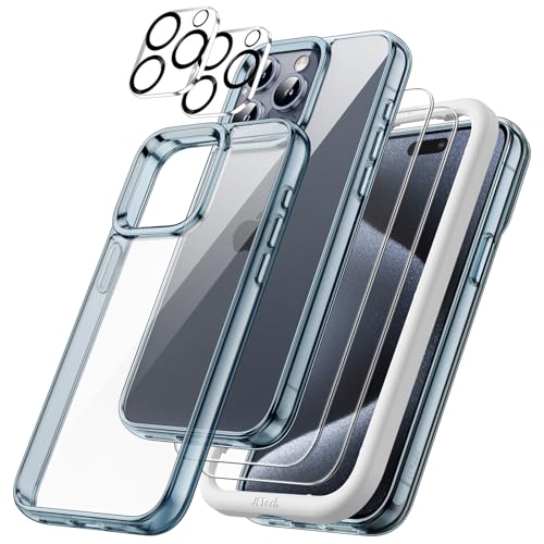 JETech 5 i 1 Fodral för iPhone 15 Pro 6,1 Tum med 2-Pack Skärmskydd i Härdat Glas och Kameralinsskydd, Lcke Gulnande Stötsäkert Buffert Mobiltelefonfodral (Blå)