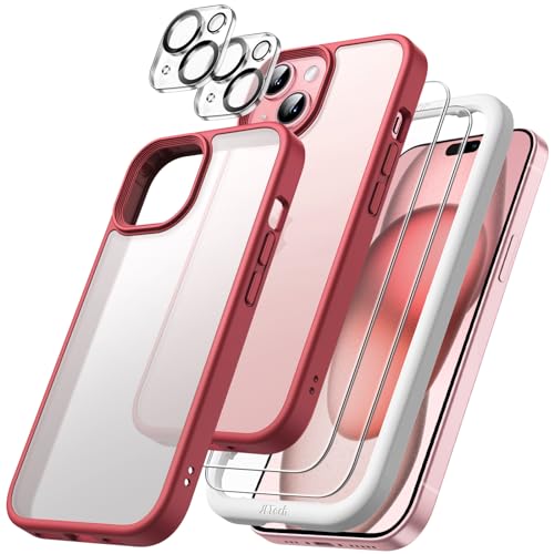 JETech 5 i 1 Matt Fodral för iPhone 15 6,1 Tum med 2-Pack Skärmskydd av Härdat Glas och Kameralinsskydd, Genomlysande Tillbaka Stötsäkert Mobilskal (Vinröd)