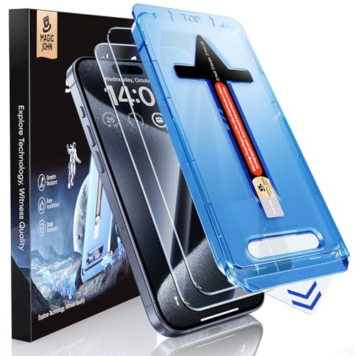 MAGIC JOHN 2-pack för iPhone 15 skärmskydd i härdat glas 6,1 tum, automatisk dammelimineringsinstallation, bubbelfri, dynamisk ö-kompatibel, HD klar, enkel installation, repfri