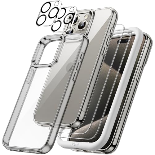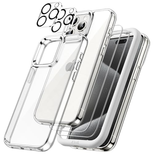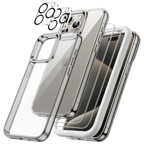 JETech 5 i 1 Fodral för iPhone 15 Pro 6,1 Tum med 2-Pack Skärmskydd i Härdat Glas och Kameralinsskydd, Lcke Gulnande Stötsäkert Buffert Mobiltelefonfodral (Klar)