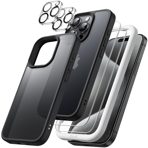 JETech 5 i 1 Matt Fodral för iPhone 15 Pro Max 6,7 Tum med 2-Pack Skärmskydd av Härdat Glas och Kameralinsskydd, Genomlysande Tillbaka Stötsäkert Mobilskal (Svart)