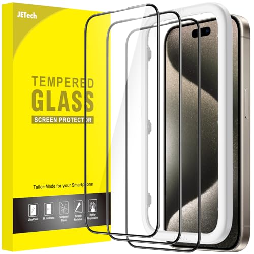 JETech Full Täckning Skärmskydd för iPhone 15 Pro 6,1 Tum, Svart Kant Screen Protector Härdat Glas Film med Enkelt Installation Verktyg, Fodral Vänligt, HD Klar, 3 Pack
