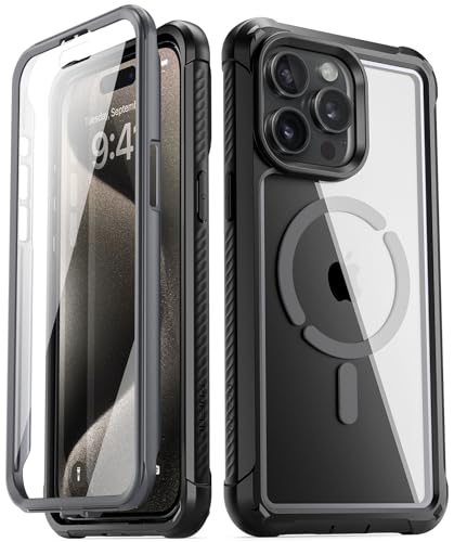 POETIC Guardian MagPro fodral kompatibelt med iPhone 15 Pro 6,1 tum, [Kompatibel med MagSafe], full kropp, hybrid, stötsäkert skyddsfodral, klart fodral med integrerat skärmskydd, svart/klar