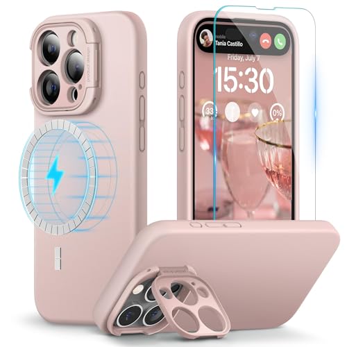 pcgaga Designad för iPhone 15 Pro Max fodral och skärmskydd, silikon telefonskydd med MagSafe, osynligt stativ, stöttåligt helkroppsskydd med mikrofiberfoder, 6,7 tum, rosa