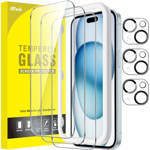 JETech Skärmskydd för iPhone 15 6,1 Tum med Kameralinsskydd, Bubbelfri, Enkelt Installation Verktyg, Screen Protector Härdat Glas Film, HD Klar, 3-Pack Varje