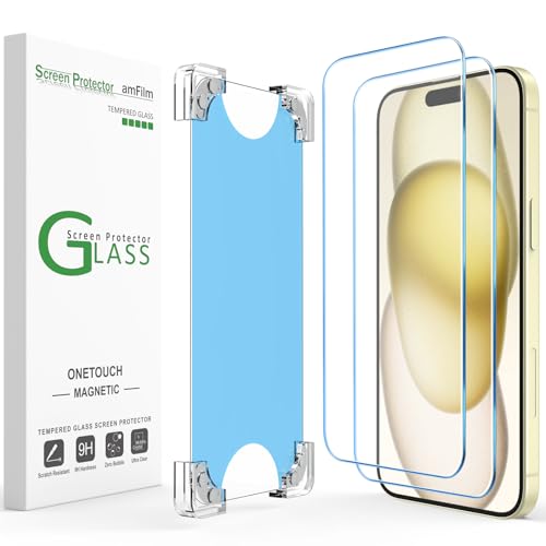 amFilm Magnetisk OneTouch 3-pack kompatibel med iPhone 15 skärmskydd 6,1 tum härdat glas tillbehör, premium enkel installationssats 9H, fodralvänlig