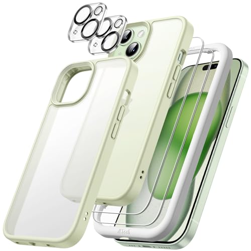 JETech 5 i 1 Matt Fodral för iPhone 15 6,1 Tum med 2-Pack Skärmskydd av Härdat Glas och Kameralinsskydd, Genomlysande Tillbaka Stötsäkert Mobilskal (Grön)