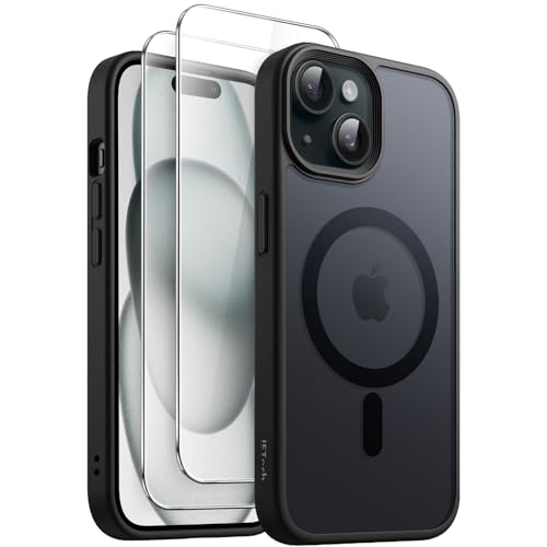 JETech 3 i 1 Magnetisk Skal för iPhone 15 Plus 6,7-Tum med 2-Pack Härdat Glas Skärmskydd, Kompatibel med MagSafe, Genomlysande Matte Baksida Stötsäker Telefon Case (Svart)