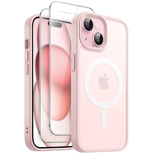 JETech 3 i 1 Magnetisk Skal för iPhone 15 Plus 6,7-Tum med 2-Pack Härdat Glas Skärmskydd, Kompatibel med MagSafe, Genomlysande Matte Baksida Stötsäker Telefon Case (Rosa)