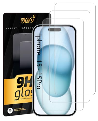 UNO' 3 st skärmskydd kompatibel med iPhone 15/15 Pro (6,1 tum), 9H härdat glas, ultrastark och transparent, bubbelfri, anti-fingeravtryck och repfri installation.