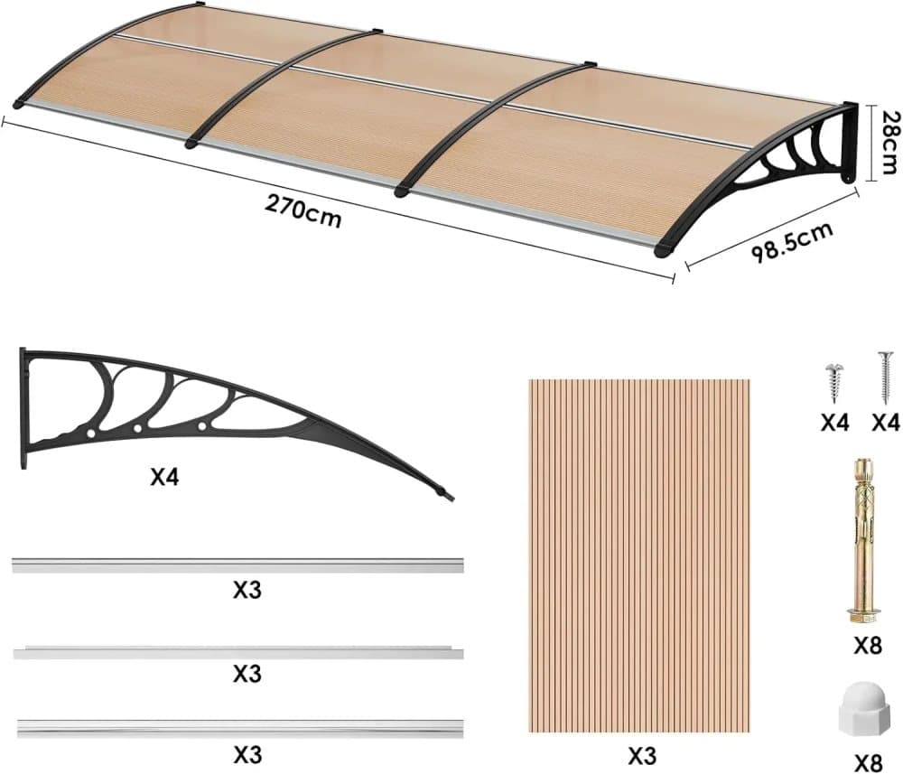 LIFERUN Skärmtak för ytterdörr, 270 x 98,5 cm, transparent bågskärm, polykarbonathållare, förstärkta aluminiumremsor, fönstermarkis, pulvertak, solskydd och regnskydd