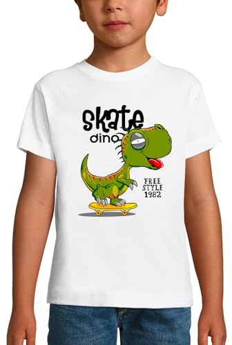 PIXEL EVOLUTION Skate dino T-shirt - dinosaurie på en skateboard barn, Vitt och blått, 6 �r