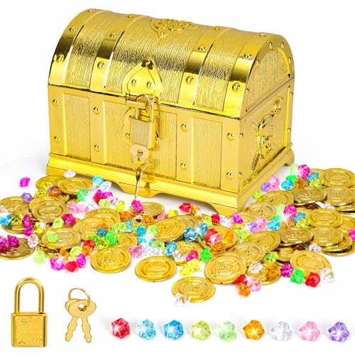 Skattkista, barnfödelsedag, guld, skattkista, barns födelsedag med lås och nyckel, 50 guldmynt barn och 100 ädelstenar för barn, Goldtaler, piratskatt för förvaring och dekoration