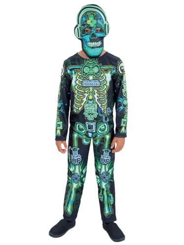 Smiffys Glow in the Dark Gamer skelettdräkt allt-i-ett och mask, halloween barn maskeradklänning, skelett utklädningsdräkter