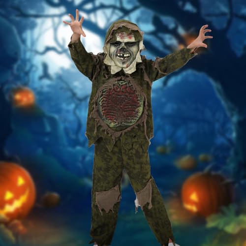 Zombie kostym barn, 120 cm halloweenkostym för barn pojkar, zombie monster, läskigt levande död halloween skelett, zombiekostym med zombie mask för klä upp temafester, fester, karneval, cosplay