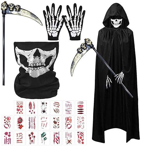 GAROMIA lisenmansdräkt, halloweenkostym barn liemannen svart kappa med sense skelett mask skelett handskar ärr tatueringar kostym läskig set för barn för halloween fest cosplay 170
