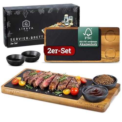 LIKAYA® Serveringsbräda "LUIS set med 2 FSC® akaciaträ med skifferplatta och såser skålar - perfekt som grillbräda, stekbräda, grilltillbehör och present till biff, hamburgare och sushi