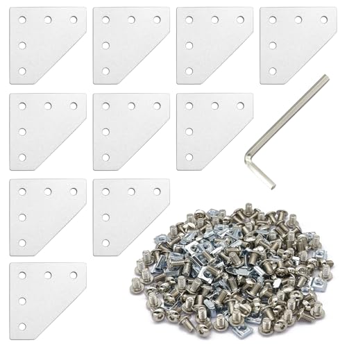 10 stycken L-formade hörnfäste-anslutningsplattor med 50 M5-T-muttrar, 50 M5-skruvar, skiftnyckel för 6 mm aluminiumextruderingsprofiler 2020 (L-formade, silver)