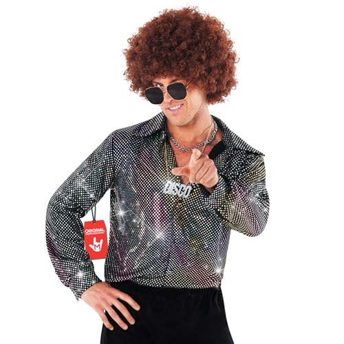 Morph Disco skjorta, 70-tals herrkostym, 70-talsdräkt, herr kostym, skimrande herrskjorta, kostym man 70-talet, karnevalskostym herr storlek XXL, Silver, XL