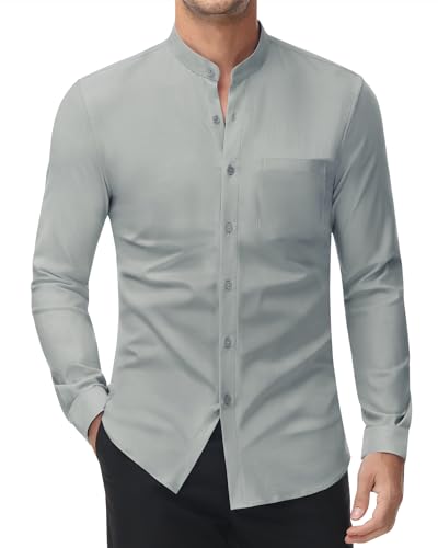 DEMEANOR Stretch skjorta utan krage herr långärmad ståkrage affärsskjorta smal passform fritidsskjorta stående skjorta, LJUSGRÅ, S
