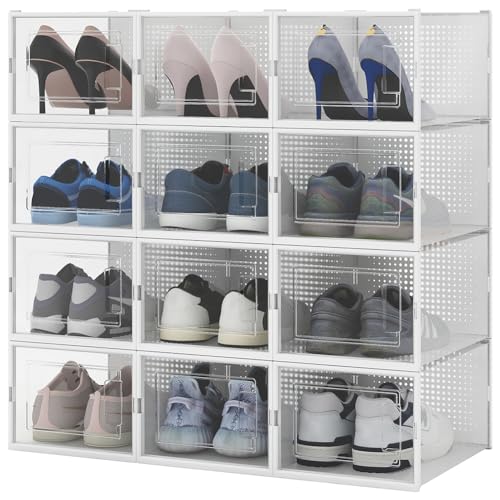 abes 12-pack skoförvaringslådor, klar plast stapelbara skoorganiseringsfack, lådtyp främre öppning skohållare behållare