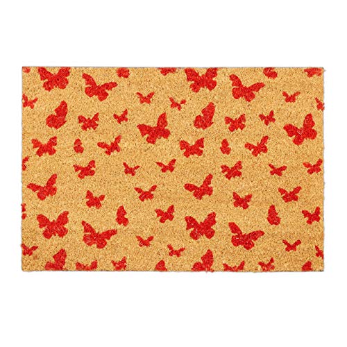 Relaxdays Dörrmatta kokos, 40 x 60 cm, kokosmatta, fjärilsmotiv, halkfri, skohållare, inomhus och utomhus, natur/röd