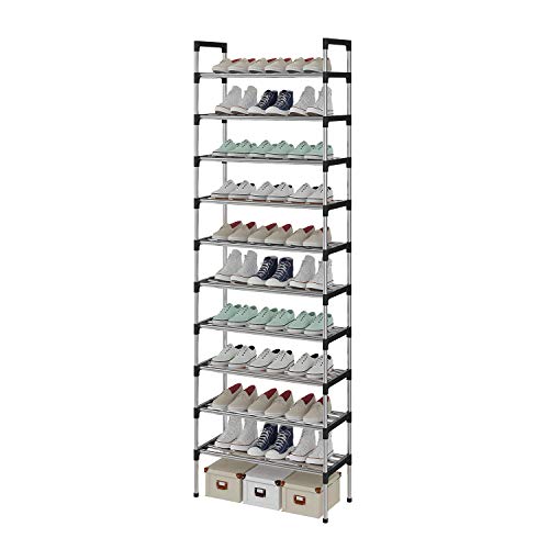 SONGMICS 10 nivåer skohylla, hög skohållare, fint skostativ, skoförvaring, metall, utrymmesbesparande, omklädningsrum, entré, 30 x 94 x 206 cm, svart LSA10BK