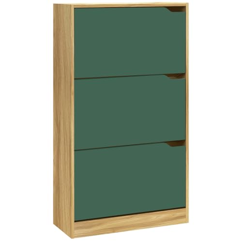 BAKAJI Skoställ MDF trä skohylla med 3 dörrar flip skohållare dubbla djup kompakt storlek smal 63 x 24 x 115 cm platsbesparande entré hem (grön och ek)