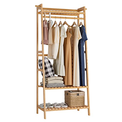 FOREHILL Klädställ med hyllor, garderobsställ, bambu, klädstång med anti-tippanordning för kläder, skohylla, väskor 164 x 70 x 42 cm