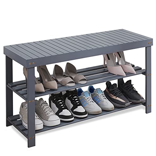 SMIBUY Bambu Skohylla Bänk, 3-Tier Shoe Organizer Förvaringshylla för entré Hall Badrum Vardagsrum (Grå)