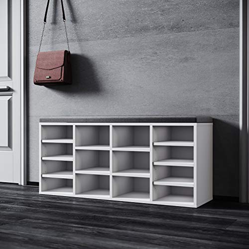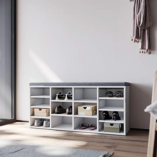 SONNI Skoskåp med bänk, skohylla, vitt trä, med justerbara hyllor, med förvaringsutrymme, skohylla, med grå sittdyna, B103,5 x D 30 x H 48 cm