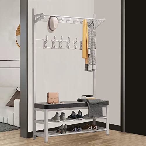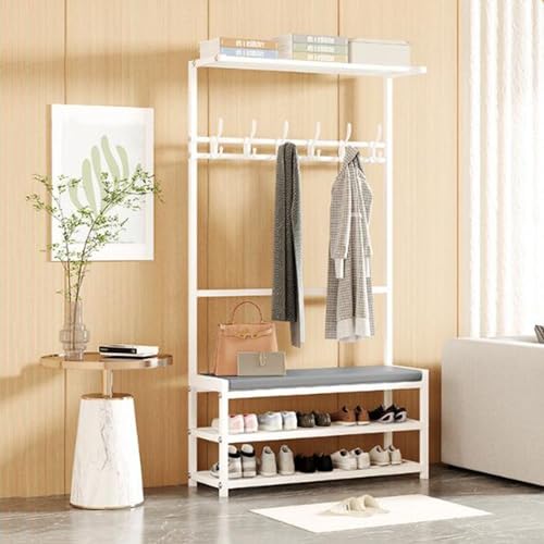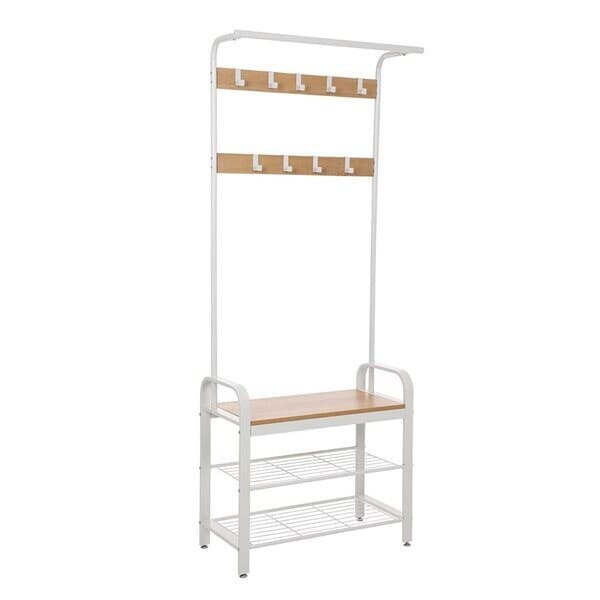 Klädhängare, ställning med skohylla och krokar, med bänk och hyllor, fristående hallträd, lätt att montera, för vardagsrum och hall
