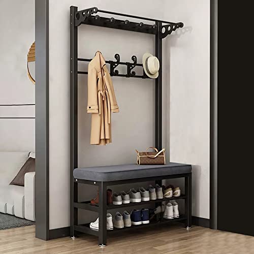 vounot Klädhängare för 4 i 1 entré med bänk och skohylla 3 nivåer med 9 avtagbara krokar, entrémöbler 185 x 85 x 33 cm, robust stålram, anti-tippsystem