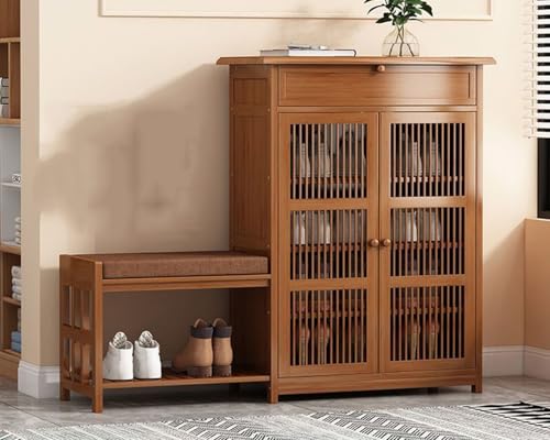 Skoförvaringsskåp med dörrar och bänk – skohylla organiserare för entré, hall, vardagsrum – skoskåp i trä med säte