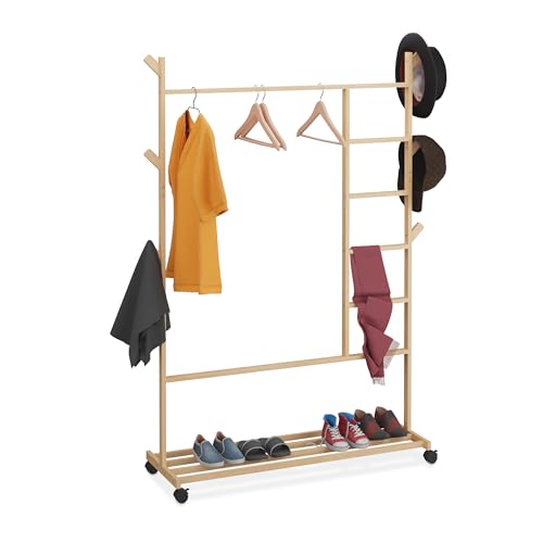 Relaxdays Klädställ, bambu, klädstång, 6 krokar, skohylla, HBT: 154 x 114 x 33 cm, rullbar garderob, natur