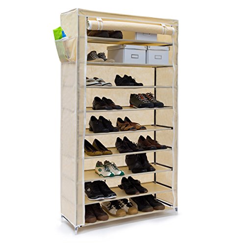 Relaxdays Skoskåp VALENTIN högt H x B x D: 161 x 88 x 30 cm skohylla med tygöverdrag och 10 hyllor tygskåp med dragkedja för dammfri förvaring, skoställ för 45 par skor, beige