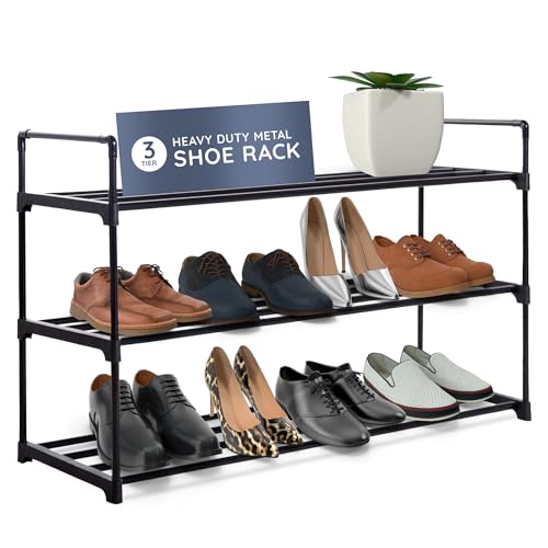 CUQOO Premium 3 nivåer kraftig metallskohylla i svart – robust skohylla i metall skor förvaring | snabb montering inga verktyg krävs | rostfri beläggning skoförvaring för hall sovrum badrum