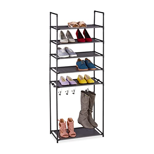 Relaxdays, svart skohylla 6 nivåer, plug-in system, för 12 par skor, 4 stövelkrokar, metall och tyg, skohylla, plast, 154 x 60 x 30 cm