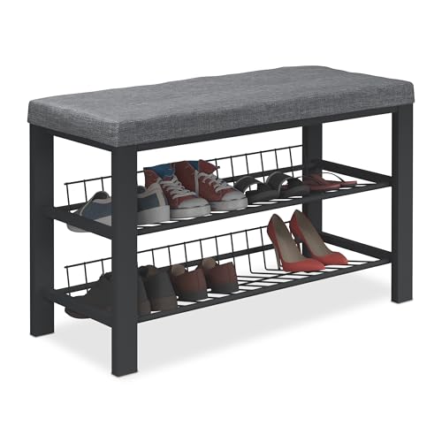 Relaxdays skobänk, klädselbänk med skohylla, 2 nivåer för skor, HBT: 50,5 x 82 x 33 cm, tyg och metall, antracit/svart