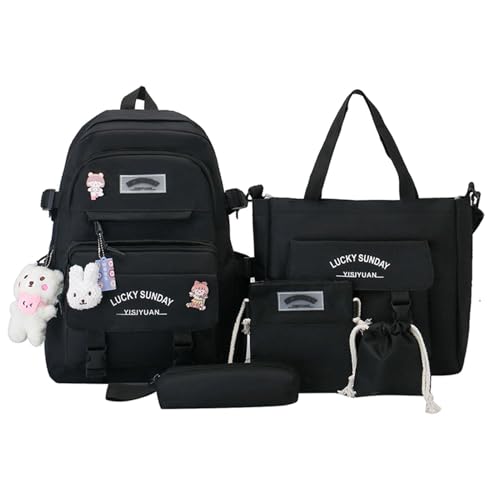 5- skolväske-set, skolväska flicka ryggsäck skolryggsäck för flickor, flickor tonåring skolryggsäck skolväska med shoppingväska pennfodral bröstväska axelväska, svart, Siehe Beschreibung