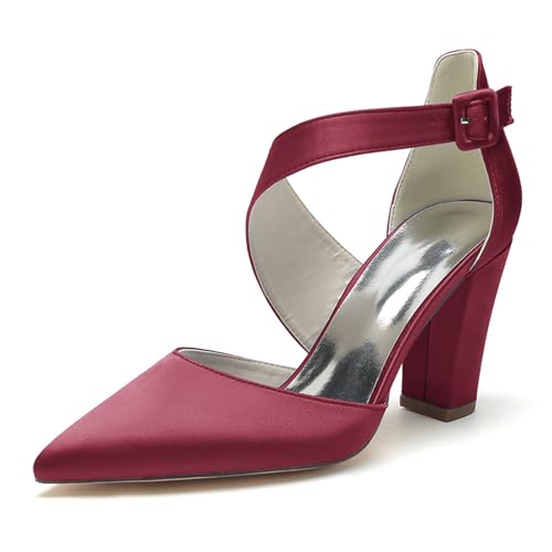 MlYJmer Dam satin högklackade fest kontor banor skor bröllop brudskor, Vinröd, 42 EU