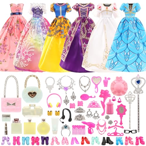 Miunana 55 prinsessklänningar kläder smycken tillbehör dockkläder fest aftonklänningar för dockor = 6 aftonklänningar 10 skor 39 tillbehör för dockor