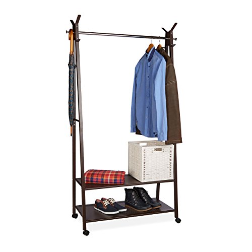 Relaxdays klädstativ i metall, garderob på hjul, 2 hyllor, 16 skor, klädskena, H x B x D: 180 x 102 x 44 cm, brun, stål, 44 x 102 x 180 cm