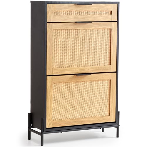 VEVOR Rotting skoskåp, smal skoförvaring organisatör med 2 flip rottinglådor och 1 glidråda, metallben, smal sko entréskåp perfekt för entré, garderob, hall, svart