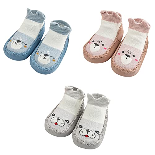 FedMois Baby Pojkar Flickor Strumpor Skor Med Halkskydd Tofflor Skor 3-Pack, blå, beige och grå, 6-12 månader